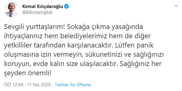 "Sevgili yurttaşlarım! Sokağa çıkma yasağında ihtiyaçlarınız hem belediyelerimiz hem de diğer yetkilliler tarafından karşılanacaktır.