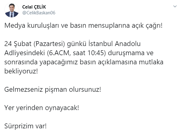 "Medya kuruluşları ve basın mensuplarına açık çağrı! 24 Şubat (Pazartesi) günkü İstanbul Anadolu Adliyesindeki (6.ACM, saat 10:45) duruşmama ve sonrasında yapacağımız basın açıklamasına mutlaka bekliyoruz!