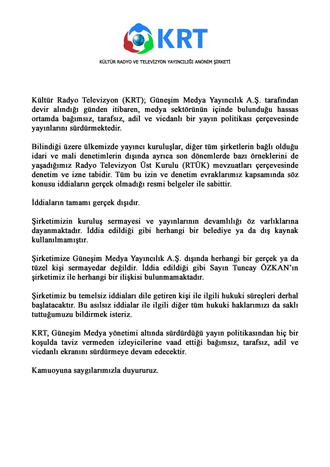 Ayrıca KRT TV'nin esas sahibinin CHP lideri Kemal Kılıçdaroğlu’nun başdanışmanı Tuncay Özkan olduğu iddiasının gerçeği yansıtmadığının da ifade edildiği açıklamada, "Şirketimiz bu temelsiz iddiaları dile getiren kişi ile ilgili hukuki süreçleri derhal başlatacaktır" denildi.