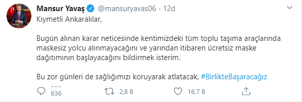 Bugün alınan karar neticesinde kentimizdeki tüm toplu taşıma araçlarında maskesiz yolcu alınmayacağını ve yarından itibaren ücretsiz maske dağıtımının başlayacağını bildirmek isterim.