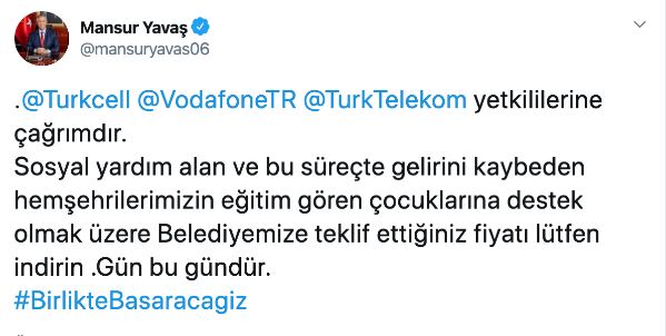 BirGün’ün edindiği bilgilere göre Yavaş, uzaktan eğitim alan ve maddi durumu yetersiz öğrenciler için internet hizmeti vermek istedi. GSM operatörleriyle görüşen Yavaş, yüksek fiyat verilmesi üzerine kişisel Twitter hesabından söz konusu şirketlere ‘fiyatı indirin’ çağrısı yaptı.