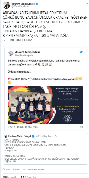 Melih Gökçek, Gökçek, Twitter'dan yaptığı açıklamada eyleme destek için yaptığı çağrıyı geri alarak "Arkadaşlar talebimi iptal ediyorum... Çünkü bunu sadece ideolojik faaliyet gösteren, sağlık hariç sadece eylemlerde gördüğümüz tabipler odası üstlenmiş. Onların hayırla işleri olmaz. Biz eylemimizi başka türlü yapacağız. Size bildireceğim..." ifadelerini kullandı.