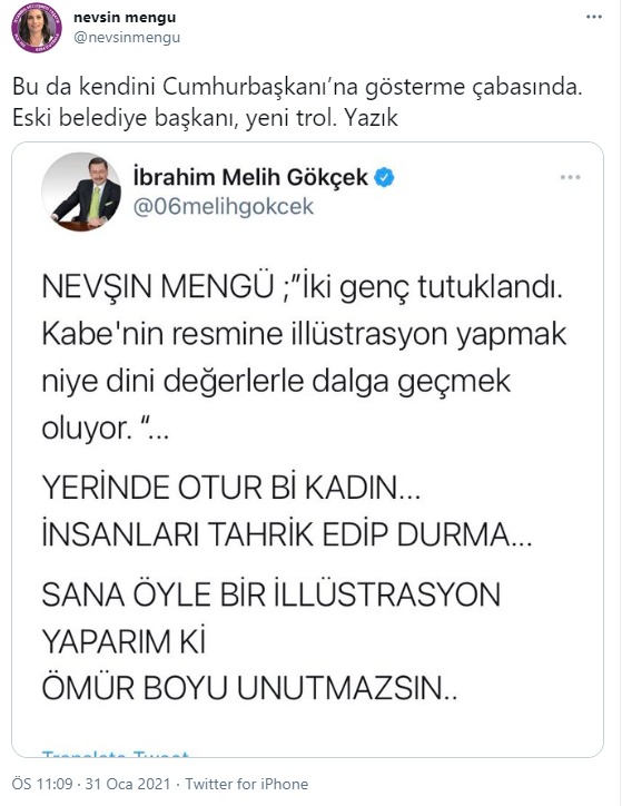 Ankara Büyükşehir Belediyesi eski başkanı AKP'li Melih Gökçek, gazeteci Nevşin Mengü'yü sosyal medya üzerinden "Sana öyle bir illüstrasyon yaparım ki ömür boyu unutamazsın" sözleriyle tehdit etti.