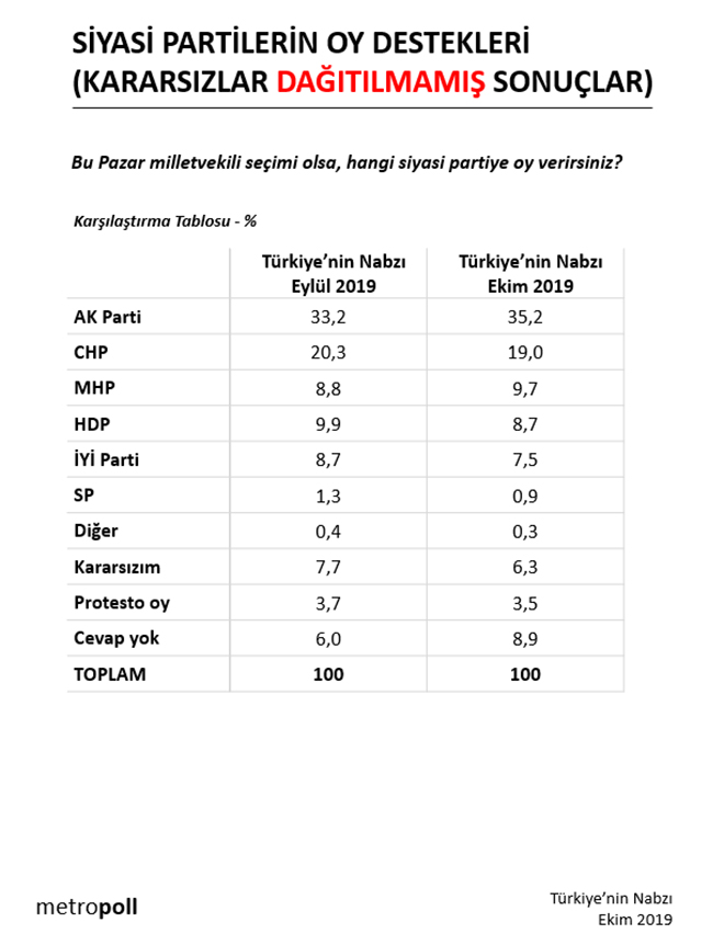 AK Parti: 33.4 - CHP: 19.1 - MHP: 8.7 - HDP: 9.7 - İYİ Parti: 7.7 - SP:0.7