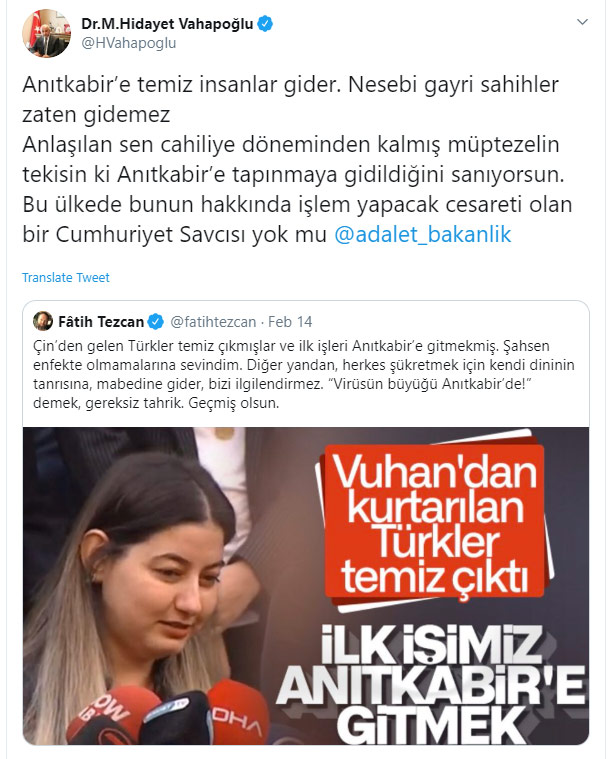 Atatürk düşmanlığıyla bilinen Fatih Tezcan, “Çin’den gelen Türkler temiz çıkmışlar ve ilk işleri Anıtkabir’e gitmekmiş. Şahsen enfekte olmamalarına sevindim. ‘Virüsün büyüğü Anıtkabir’de çıkışına MHP Genel Başkan Yardımcısı Hidayet Vahapoğlu, tepki göstererek, bir tane savcı yok mu? çağrısı yaptı.