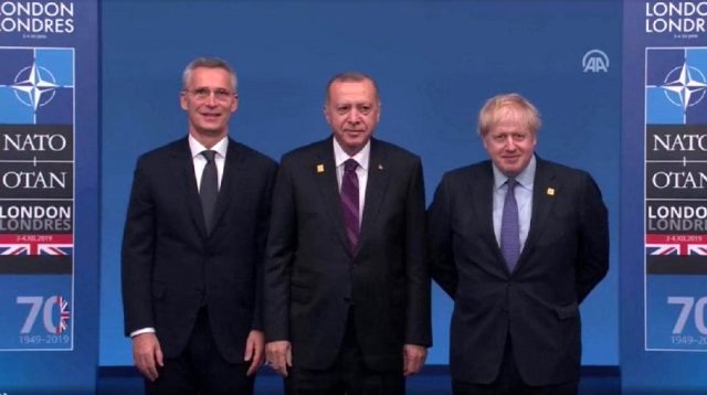 NATO Liderler Zirvesi kapsamında Londra'da bulunan Cumhurbaşkanı Erdoğan, NATO Genel Sekreteri Stoltenberg ve İngiltere Başbakan'ı Johnson ile sahnede tokalaştıktan sonra fotoğraf çekilmeyi unutarak sahneden inmeye yeltendi.