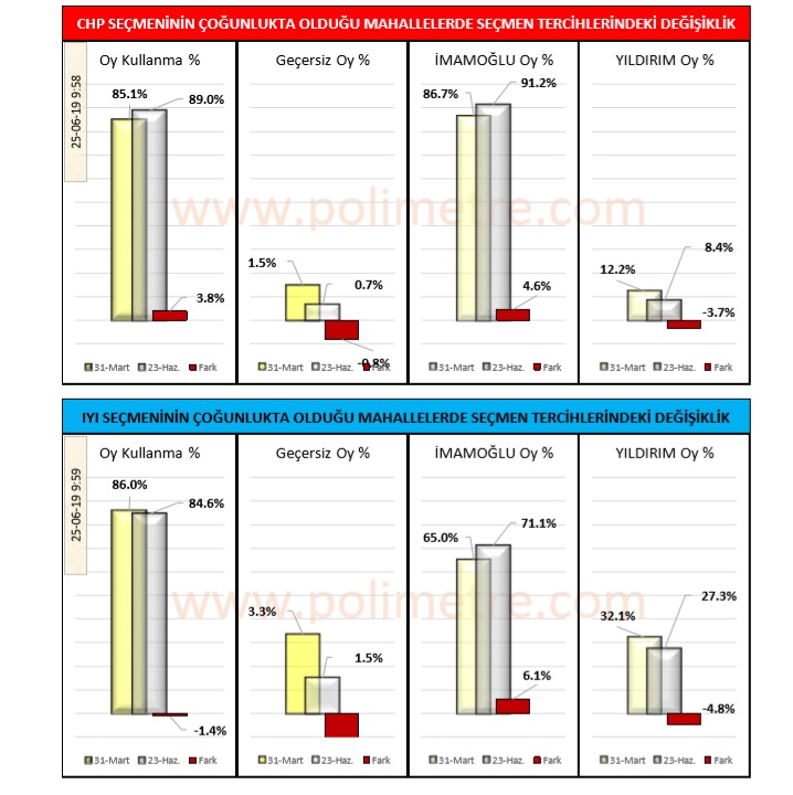 4. IYI Seçmeninin yoğun olduğu mahallelerde; İmamoğlu’na destek (%6.1) artarken, Oy Kullanma Oranı (%1.4), Geçersiz Oy Oranı (%1.8) ve Yıldırım’a destek oranı (%4.8) azalıyor.