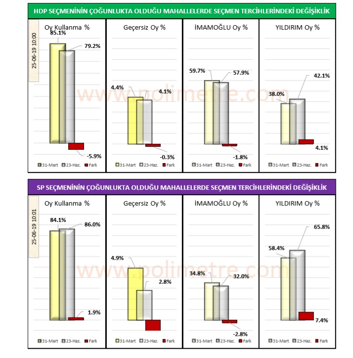 HDP Seçmeninin yoğun olduğu mahallelerde; Yıldırım’a destek oranı yüzde 4.1 artarken, İmamoğlu’na destek yüzde 1.8 oranında azaldı.