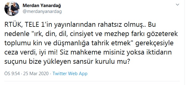 Kararı sosyal medya hesabından duyuran TELE 1'in Genel Yayın Yönetmeni Merdan Yanardağ, RTÜK'ün skandal kararına, "Siz mahkeme misiniz yoksa iktidarın suçunu bize yükleyen sansür kurulu mu?" diyerek tepki gösterdi.