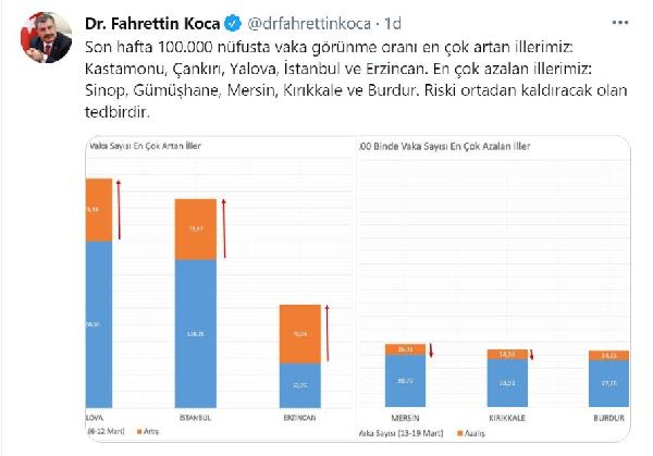 Bakan Koca, Twitter hesabından yaptığı açıklamada, "Son hafta 100 bin nüfusta vaka görünme oranı en çok artan illerimiz; Kastamonu, Çankırı, Yalova, İstanbul ve Erzincan. En çok azalan illerimiz; Sinop, Gümüşhane, Mersin, Kırıkkale ve Burdur. Riski ortadan kaldıracak olan tedbirdir'' ifadelerini kullandı.
