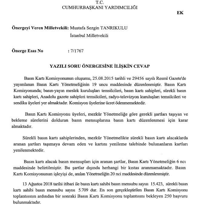 Oktay, daha önce aynı konuda CHP İstanbul Milletvekili Sezgin Tanrıkulu’nun sorusuna 13 Ağustos 2018 itibariyle basın kartı gazeteci sayısını 15 bin 423 olarak bildirmişti.