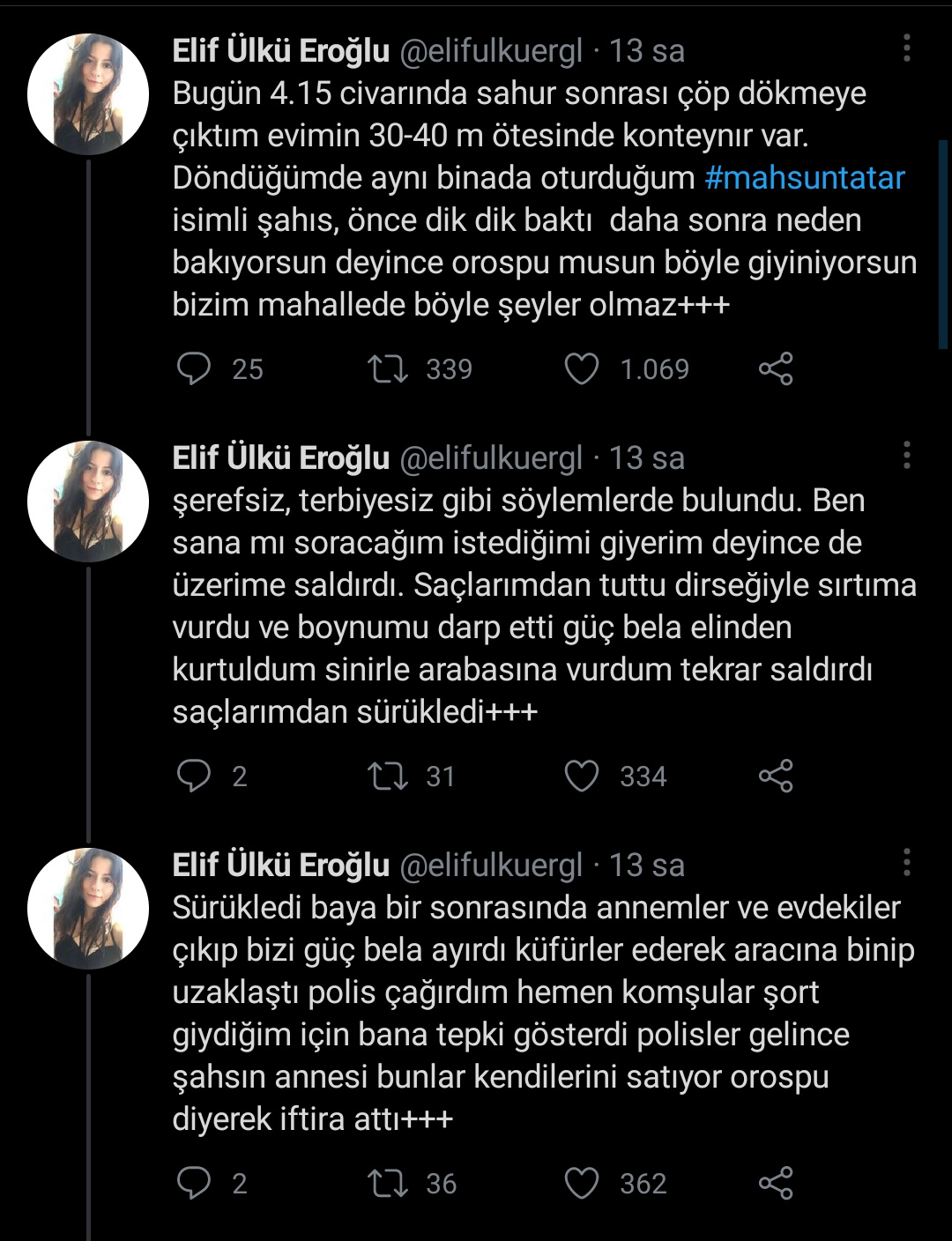 Elif Ülkü Eroğlu sahurdan sonra sokağındaki konteynnere çöp dökmeye giderken M. T adlı komşusu tarafından ''O..pu musun böyle giyiniyorsun diye sözlü saldırıya uğradığını, ardından tartaklandığını duyurdu. Şikayet edilen T. serbest kaldı.