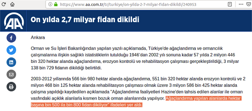 İktidarın sesi Anadolu Ajansı’nın iktidarın “ağaçlandırma” zaferlerini anlatırken yazdığı gereksiz bilgilerin bir gün ayaklarına dolanabileceğinin farkında değiller. Devlet düzeyinde güvenilir bilgilere göre 10.000 m2 olan bir hektarlık alana 1500 ila 1800 fidan dikildiği belirtiliyor, “Ajans” da görevini yapıp yazıyor.
