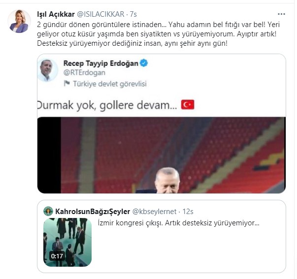 “2 gündür dönen görüntülere istinaden” ifadelerini kullanan Açıkkar, “Yahu adamın bel fıtığı var bel” dedi. Işıl Açıkkar, paylaşımının devamında “Yeri geliyor otuz küsür yaşımda ben siyatikten vs yürüyemiyorum. Ayıptır artık! Desteksiz yürüyemiyor dediğiniz insan, aynı şehir aynı gün” ifadelerini kullanarak Erdoğan’ın penaltı attığı fotoğrafı paylaştı.