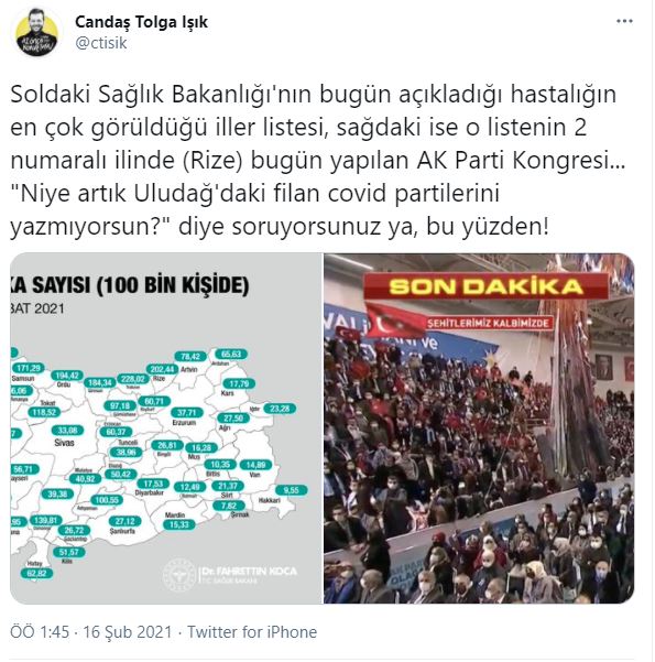 Sosyal medya hesabından paylaşım yapan Işık mesajında; "Soldaki Sağlık Bakanlığı'nın bugün açıkladığı hastalığın en çok görüldüğü iller listesi, sağdaki ise o listenin 2 numaralı ilinde (Rize) bugün yapılan AK Parti Kongresi... "Niye artık Uludağ'daki filan covid partilerini yazmıyorsun?" diye soruyorsunuz ya, bu yüzden!" ifadelerini kullandı.