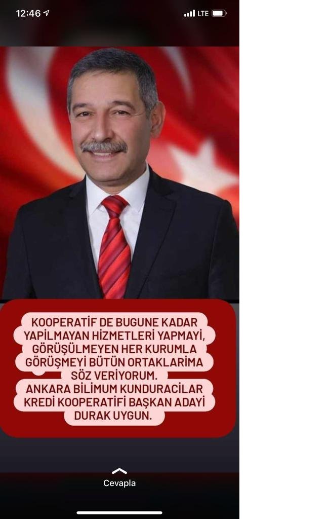 Kamuoyunu günlerce meşgul eden Aleyna Çakır cinayetinin baş zanlısı Ümitcan Uygun’un babası Durak Uygun sosyal medya hesabından ilginç bir paylaşımda bulundu. Halihazırda Ankara Ayakkabıcılar ve Çantacılar Esnaf Odası Başkanı olan Durak Uygun, Instagram hesabından yaptığı paylaşımda Ankara Bilimum Kunduracılar Kredi Kooperatifi’ne aday olduğunu açıkladı.