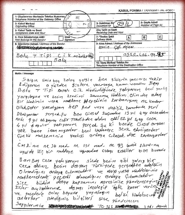 Benim dosyam gerçekten Türkiye'de adaletin olmadığını ortaya çıkaracaktır… Dosyayı adresinize göndereceğim…"
