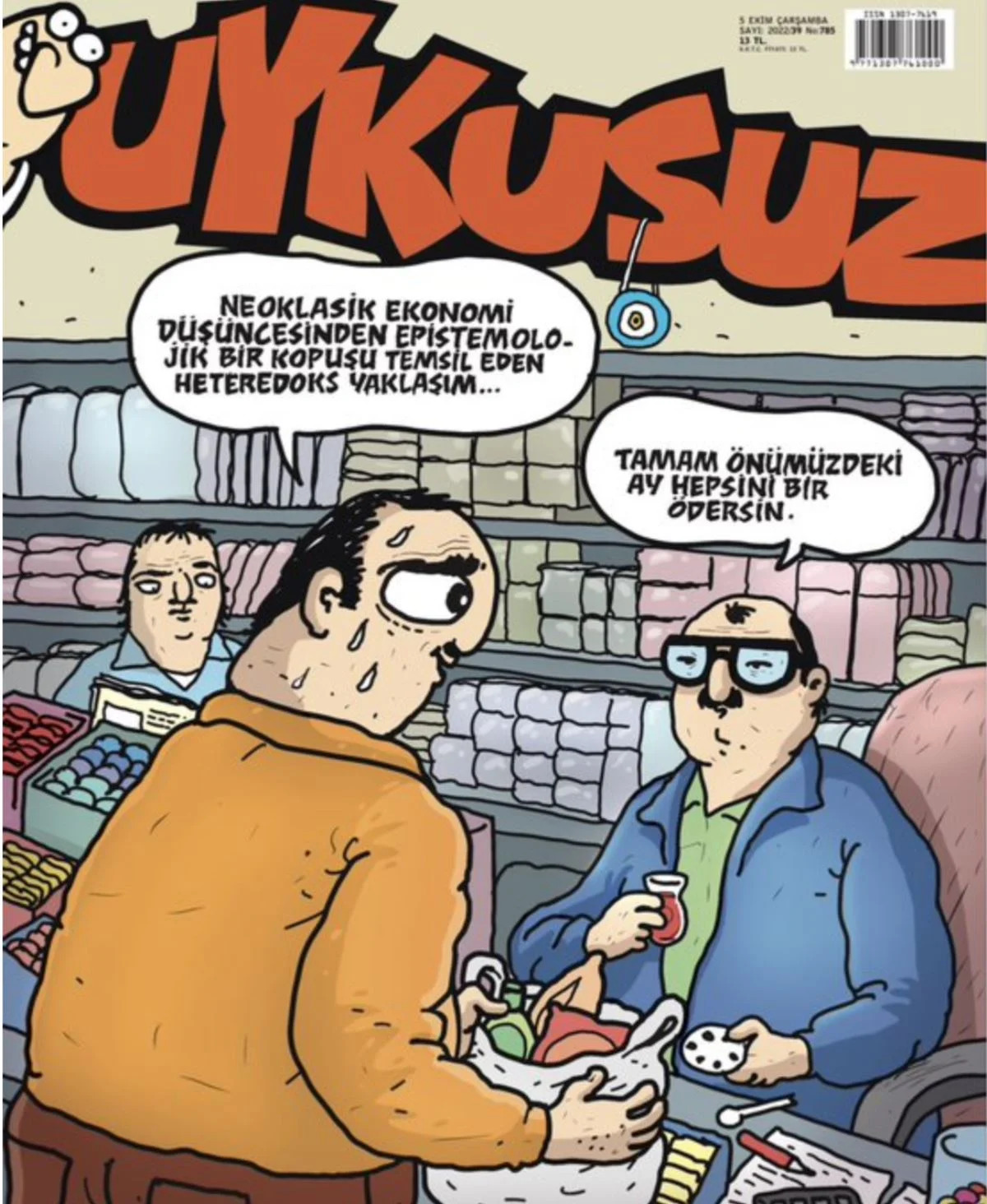 Haftalık mizah ve karikatür dergisi Uykusuz, bu haftaki kapağında Hazine ve Maliye Bakanı Nureddin Nebati'nin "Neo klasik ekonomi düşüncesinden epistemolojik bir kopuşu temsil eden heterodoks yaklaşım...' ifadelerine yer verdi.