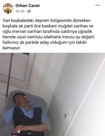 AKP Van İl Başkanı Kayhan Türkmenoğlu, AKP Başkale İlçe Başkanı Muğdat Saruhan’ın aralarında bulunduğu heyet, depremin vurduğu Özpınar ve Gelenler köyüne gitti. Bu hafta sonu yapılacak kongrede aday olan Orhan Caner de heyet ile birlikte köy gezisine katıldı. Bu sırada Muğdat Saruhan ve Orhan Caner arasında bir tartışma çıktı. Tartışmanın büyümesi üzerine Saruhan ve oğlu Mervan Saruhan, ilçe başkan adayı Orhan Caner’i darp etti.