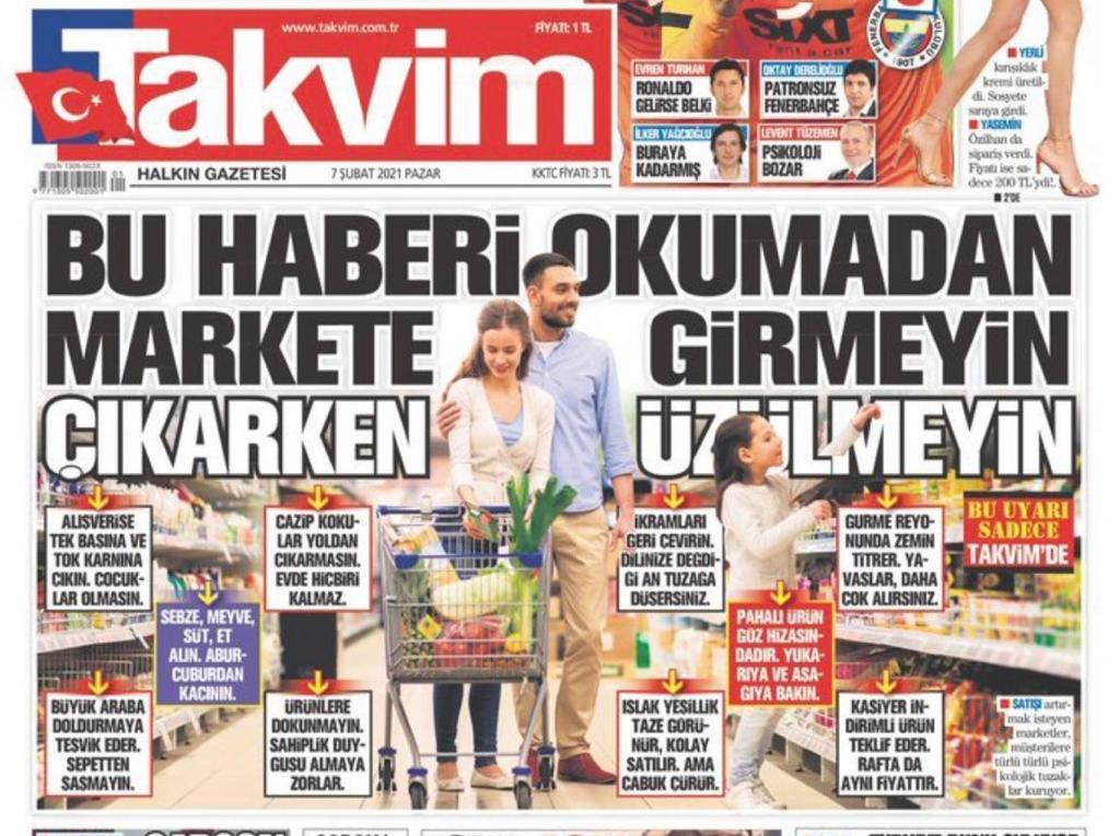Takvim gazetesi, manşete taşıdığı "Bu haberi okumadan markete girmeyin, çıkarken üzülmeyin" başlıklı haberde, okurlarına market alışverişlerinde "fazla harcama yapmamaları" için ipuçları verdi. Takvim'in hazırladığı ipuçları arasında "Cazip kokular yoldan çıkarmasın, alışverişe çocuklarla çıkmayın, sepet kullanın" gibi maddeler yer aldı.