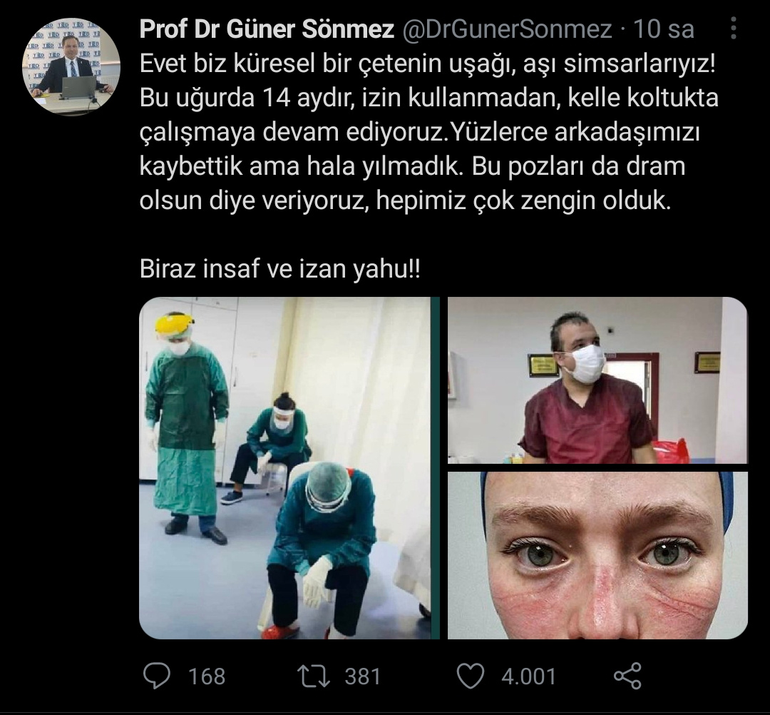 Evet biz küresel bir çetenin uşağı, aşı simsarlarıyız! Bu uğurda 14 aydır, izin kullanmadan, kelle koltukta çalışmaya devam ediyoruz.Yüzlerce arkadaşımızı kaybettik ama hala yılmadık. Bu pozları da dram olsun diye veriyoruz, hepimiz çok zengin olduk.