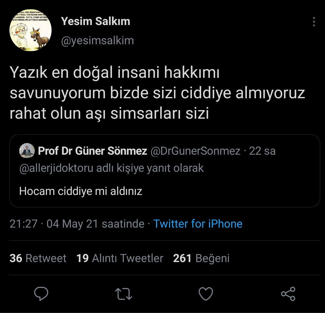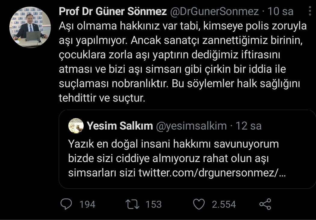 Yeşim Salkım Prof. Sönmez'in yanıtını alıntılayarak ''Yazık en doğal insani hakkımı savunuyorum bizde sizi ciddiye almıyoruz rahat olun aşı simsarları sizi'' ifadelerini kullandı.